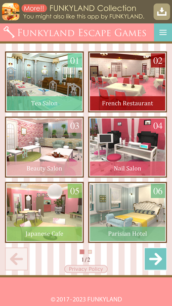 FUNKYLAND Escape Games är en fängslande app för iPhone som erbjuder spelare möjligheten att delta i 10 olika escape games. Varje spel är unikt och utspelar sig i olika tematiska rum, såsom en teasalong, fransk restaurang och ett japanskt café. Spelet är designat för att vara enkelt att spela, där användare bara behöver trycka för att interagera med objekt. Genom att dubbeltappa på föremålen kan man förstora dem för bättre visning, och inställningar kan justeras via en knapp i det övre högra hörnet.